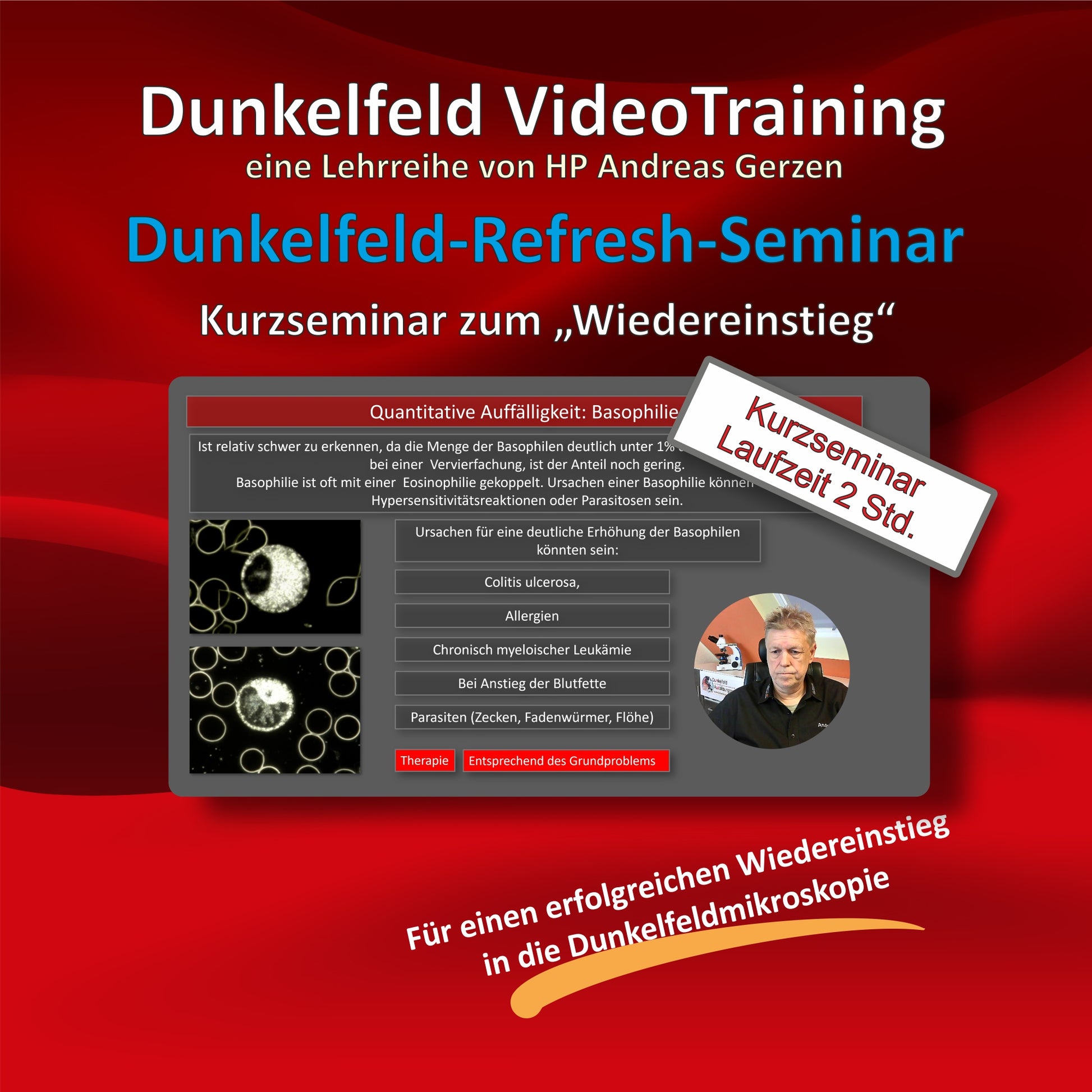Das Dunkelfeld-Refresh-Seminar ist für Teilnehmer des Basisseminar von HP-Gerzen gedacht, die sich eine zeitlang nicht mehr mit dieser Materie beschäftigt haben und nun den Wiedereinstieg planen. Es werden etwa 60% des Basisseminars wiederholt, auf die physikalischen Grundlagen der DF-Mikroskopie wird hier weitgehend verzichtet. Behandelt werden die Mikroskopeinstellung, die Blutabnahme, die zelluläre Erkennung, die Grundlagen der Basisdiagnostik und Fehlervermeidung. Es handelt sich um eine von HP A. Gerzen per Video kommentierte Powerpointpräsentation mit einer Laufzeit von 2 Std. Ideal für Wiedereinsteiger.